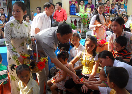 Đồng chí Nguyễn Đình Bàng tặng quà các cháu Trường mầm non Phúc Thuận 1, Phổ Yên
