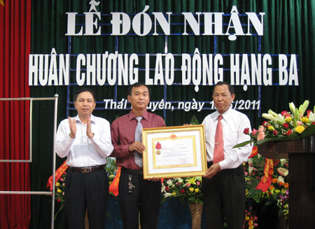 Sáng 18-6, Hợp tác xã (HTX) Kinh doanh chế biến lâm sản và Vật liệu xây dựng (VLXD) T.P Thái Nguyên đã long trọng tổ chức Lễ đón nhận Huân chương Lao động hạng Ba (ảnh). Đến dự có đồng chí Dương Ngọc Long, Ủy viên Ban Thường vụ Tỉnh ủy, Bí thư Thành ủy Thái Nguyên.