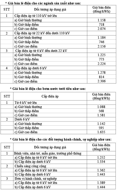 * Giá bán điện theo thời gian sử dụng điện trong ngày (sau đây gọi là hình thức ba giá), như sau: