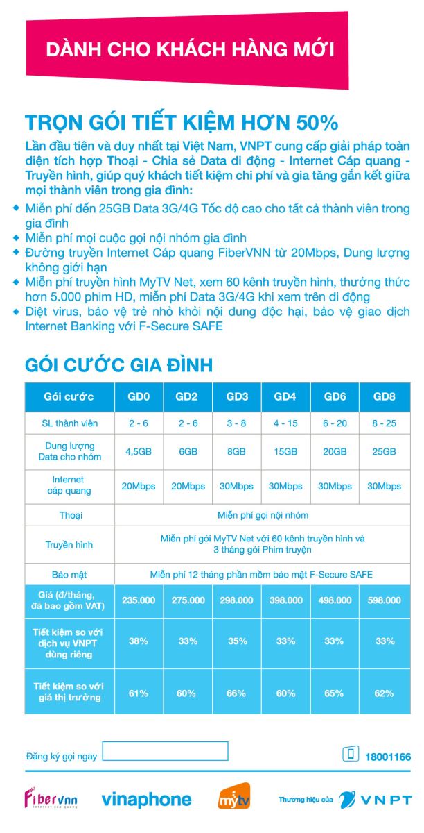Khách hàng khi sử dụng các dịch vụ viễn thông riêng lẻ sẽ phải chi trả 70.000đ/người để đăng ký gói 2GB Internet di động tốc độ cao và khoảng 40.000đ/ tháng cước di động (thoại). Bên cạnh đó người dùng sẽ phải trả thêm 100.000đ phí truyền hình cáp và khoảng 220.000đ cho Internet cáp quang 20 Mbps. Như vậy, tổng chi phí một gia đình với hai thành viên phải thanh toán hàng tháng xấp xỉ 540.000đ. Trong khi đó, nếu đăng ký gói cước Gia Đình thì chi phí chỉ còn 235.000đ mỗi tháng để sử dụng 4,5GB Internet di động, Cáp quang 20Mbps, MyTV Net hấp dẫn, miễn phí thoại nội nhóm di động VinaPhone và cố định VNPT, miễn phí giải pháp bảo mật F-Secure Safe và giảm 20% khi đăng ký MyTV. Tính ra, mỗi gia đình tiết kiệm hơn 50% chi phí và còn nhận thêm hàng loạt ưu so với việc sử dụng dịch vụ riêng lẻ và so với giá thị trường.