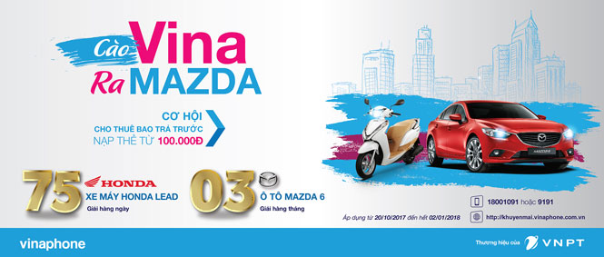 Chỉ cần nạp thẻ mệnh giá 100.000 đồng trở lên, thuê bao trả trước của VinaPhone sẽ có cơ hội trúng ngay 75 xe máy Honda Lead và 03 ô tô Mazda 6. Đây là những giải thưởng “khủng” của chương trình khuyến mại “Cào Vina Ra Mazda” được VinaPhone rầm rộ tổ chức chào đón các dịp lễ lớn cuối năm 2017 này.