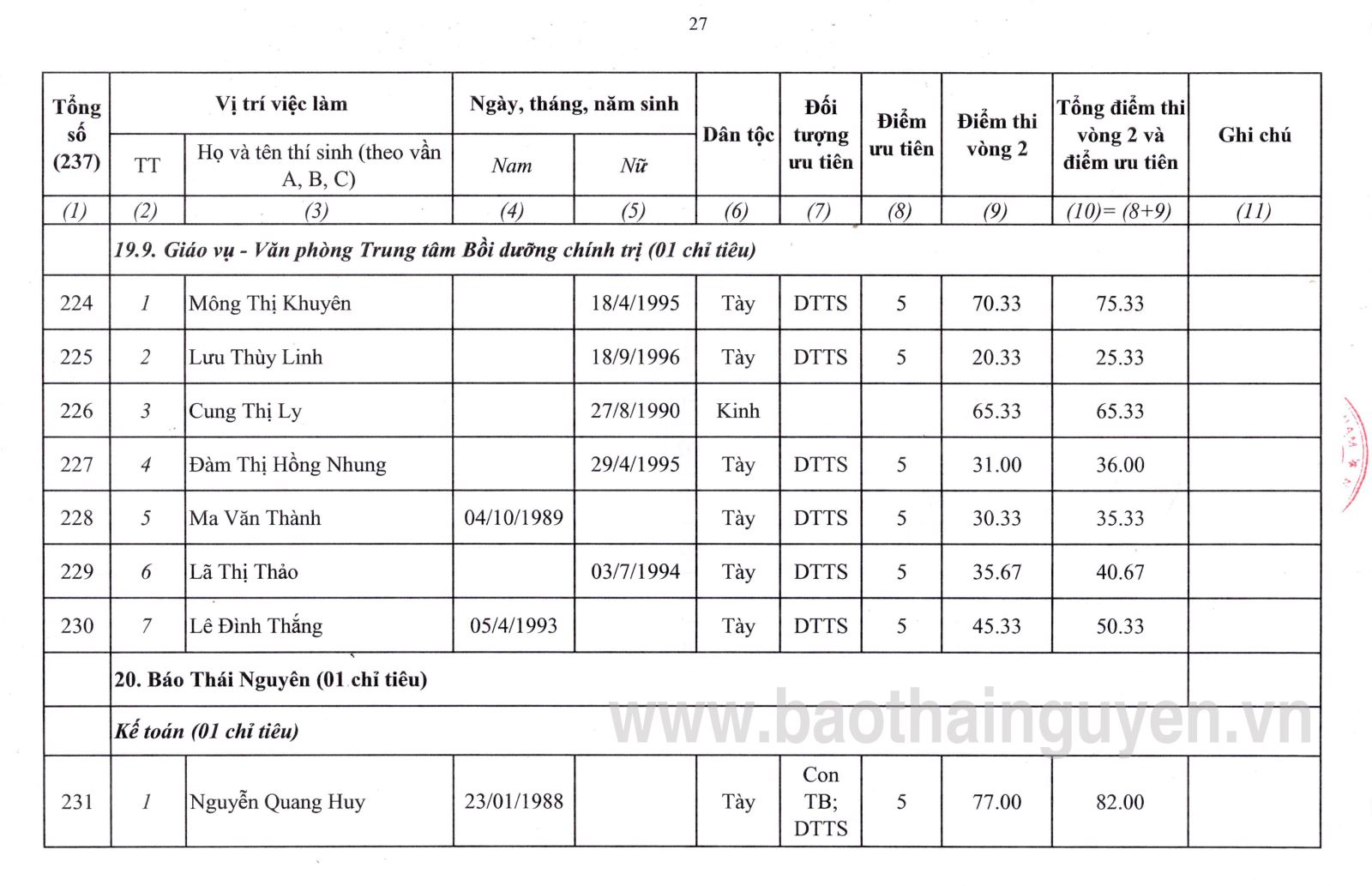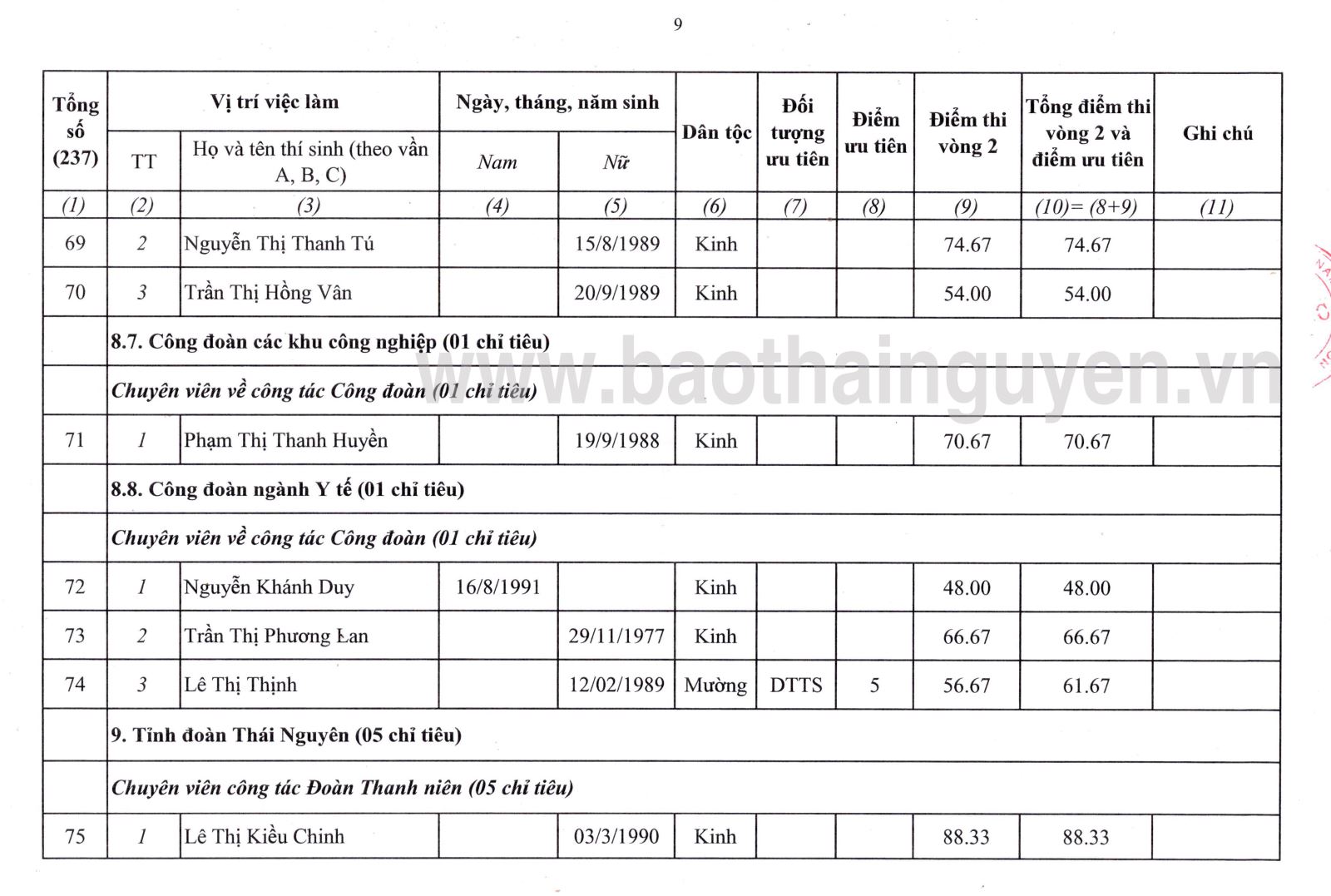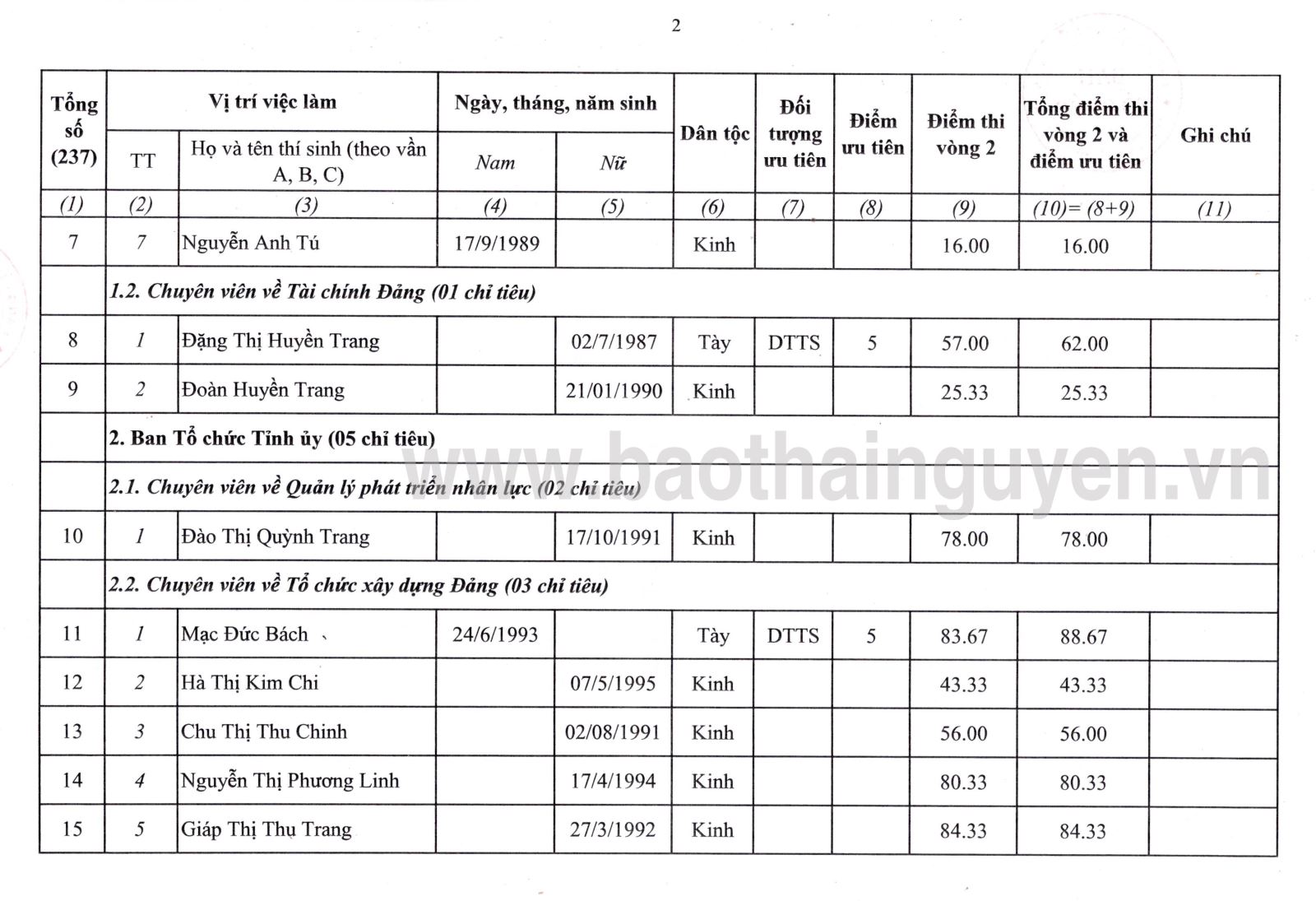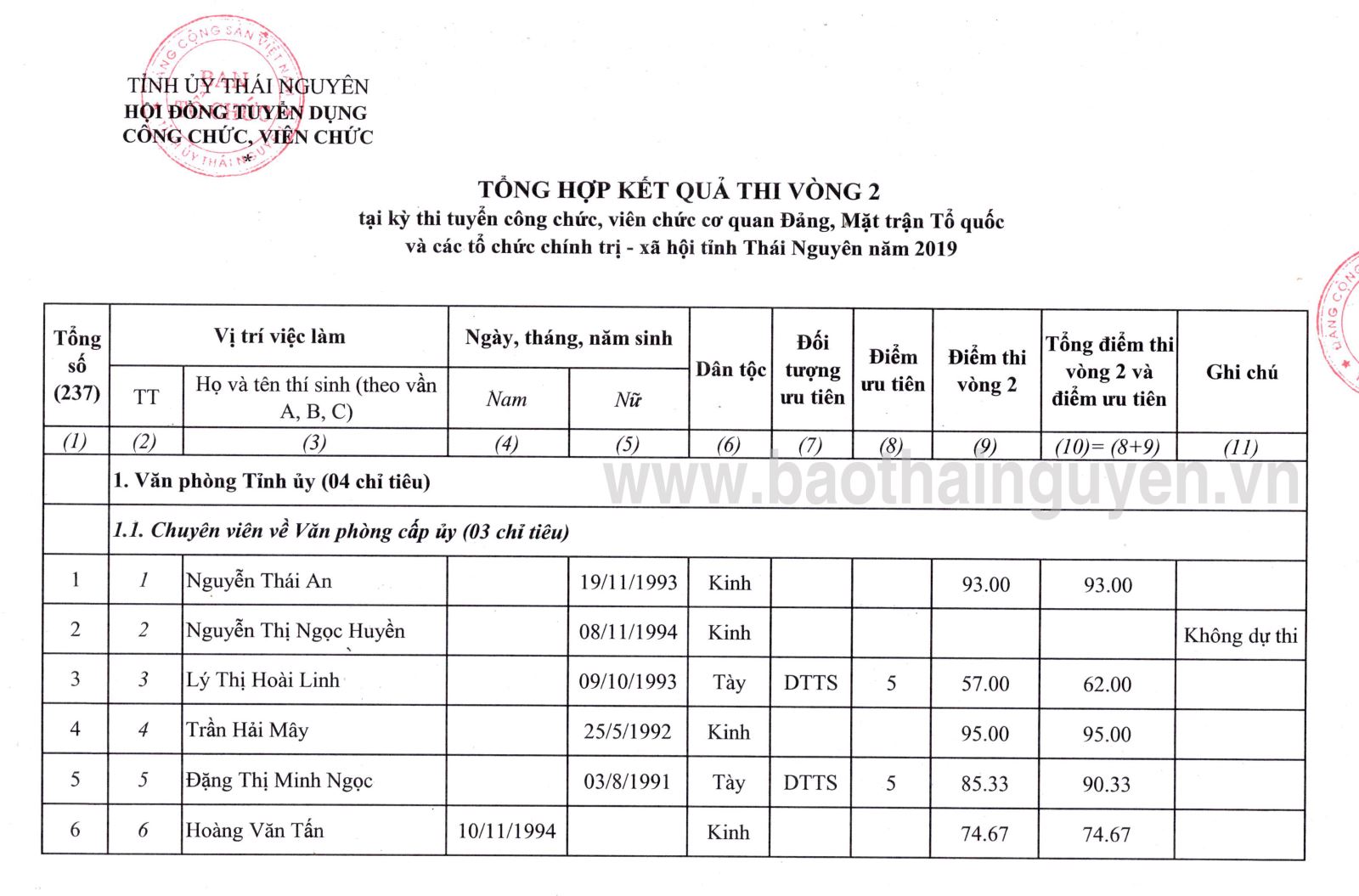 Thực hiện Kế hoạch số 03-KH/HĐTD ngày 19/6/2019 của Hội đồng tuyển dụng công chức, viên chức về việc tổ chức thi tuyển công chức, viên chức cơ quan Đảng, Mặt trận Tổ quốc và các tổ chức chính trị - xã hội tỉnh Thái Nguyên năm 2019. Báo Thái Nguyên đăng tải Thông báo kết quả thi vòng 2 tại kỳ thi tuyển công chức, viên chức cơ quan Đảng, Mặt trận Tổ quốc và các tổ chức chính trị - xã hội tỉnh Thái Nguyên năm 2019 như sau: