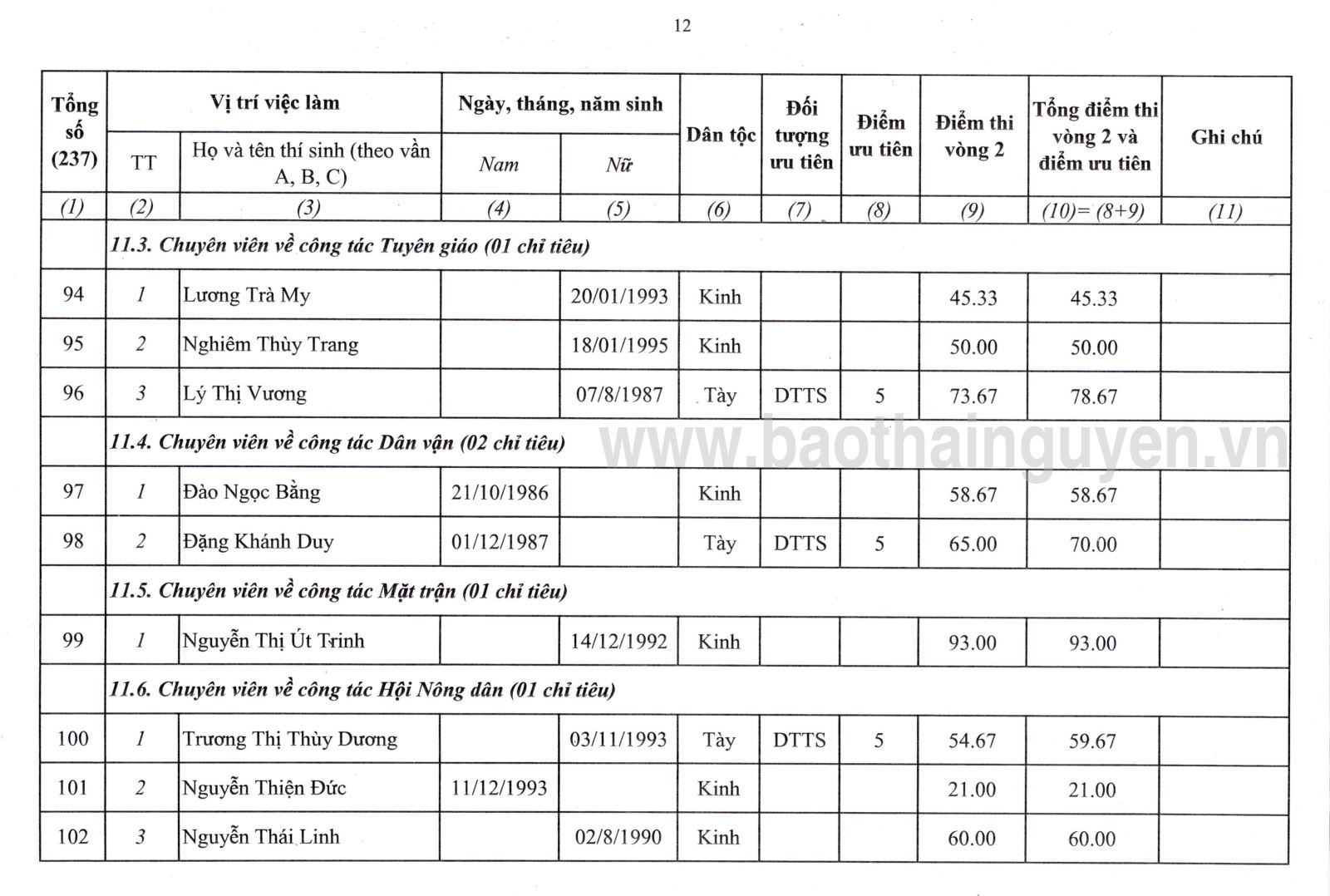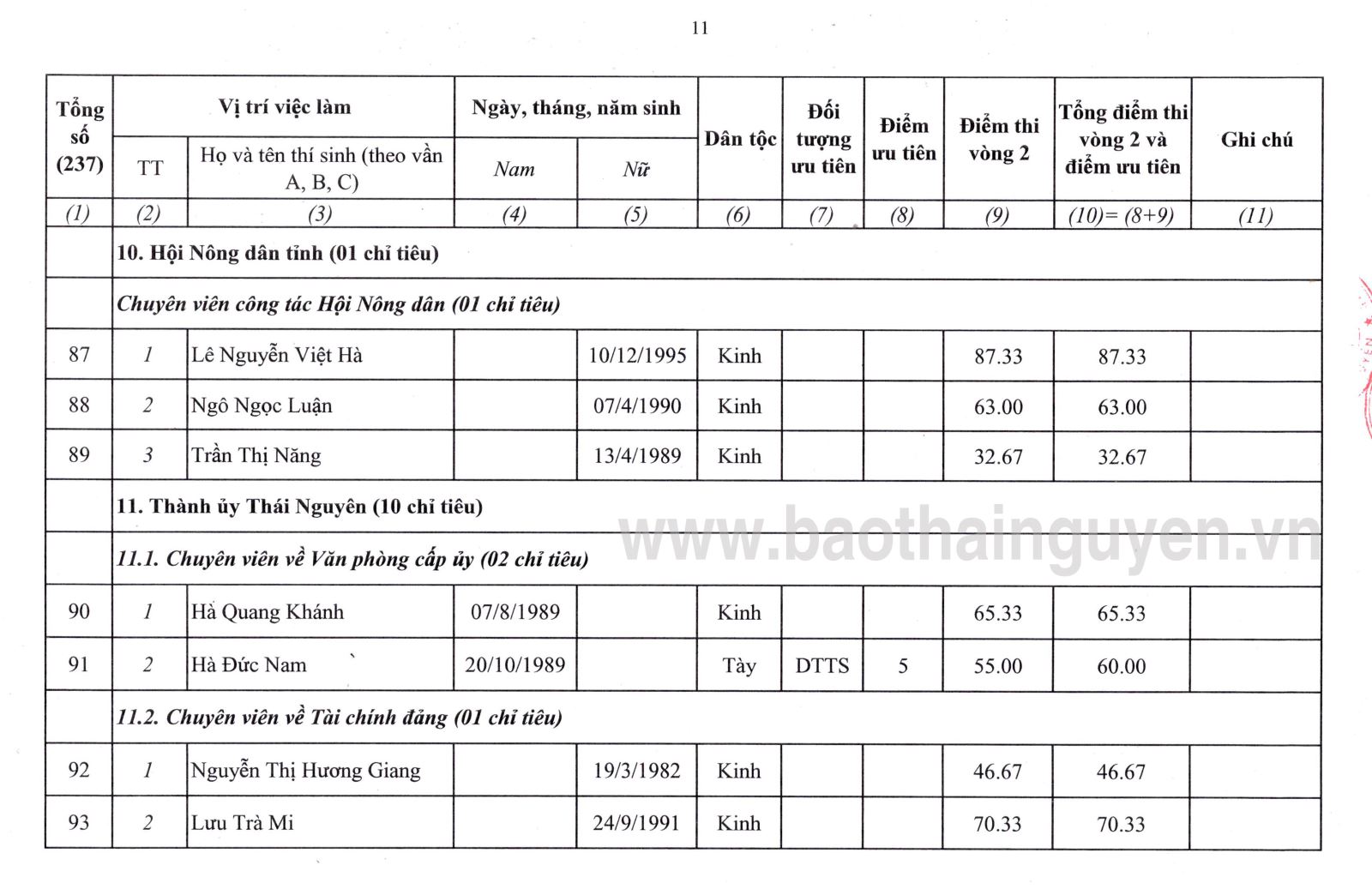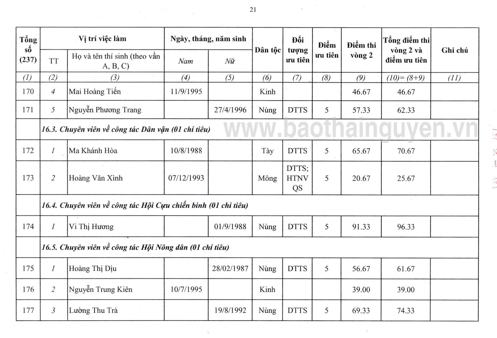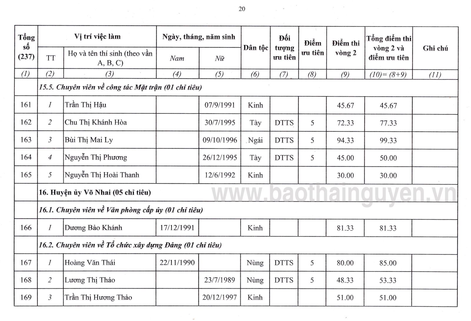 Thực hiện Kế hoạch số 03-KH/HĐTD ngày 19/6/2019 của Hội đồng tuyển dụng công chức, viên chức về việc tổ chức thi tuyển công chức, viên chức cơ quan Đảng, Mặt trận Tổ quốc và các tổ chức chính trị - xã hội tỉnh Thái Nguyên năm 2019. Báo Thái Nguyên đăng tải Thông báo kết quả thi vòng 2 tại kỳ thi tuyển công chức, viên chức cơ quan Đảng, Mặt trận Tổ quốc và các tổ chức chính trị - xã hội tỉnh Thái Nguyên năm 2019 như sau: