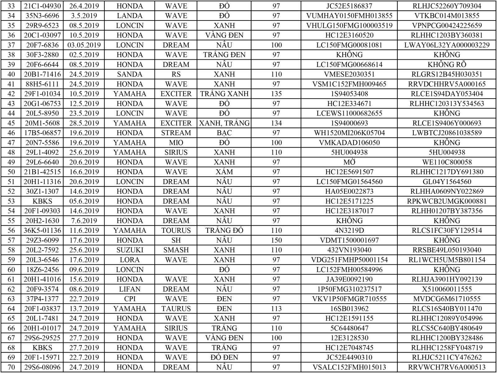 Căn cứ Luật xử lý vi phạm hành chính năm 2012; Thông qua công tác TTKS giao thông đường bộ, Công an thị xã Phổ Yên đã phát hiện, xử lý các trường hợp vi phạm, đơn vị đã tạm giữ các phương tiện vi phạm hành chính. Đến nay đã quá hạn tạm giữ nhưng người vi phạm không đến xử lý không đến để giải quyết, gồm 172 phương tiện (có danh sách kèm theo).