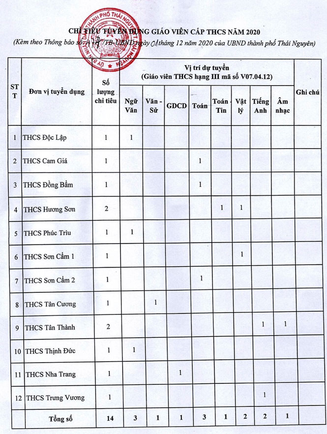 Trên đây là Thông báo tuyển dụng viên chức làm giáo viên các Trường Mầm non, Tiểu học, THCS, Trường Tiểu học và THCS công lập trực thuộc UBND thành phố Thái Nguyên năm 2020. UBND thành phố yêu cầu các đơn vị nghiêm túc triển khai thực hiện. Trong quá trình thực hiện có gì khó khăn, vướng mắc báo cáo về UBND thành phố (qua Phòng Giáo dục và Đào tạo thành phố, Phòng Nội vụ thành phố) để xem xét, giải quyết./.
