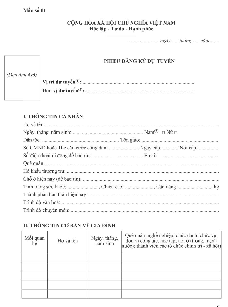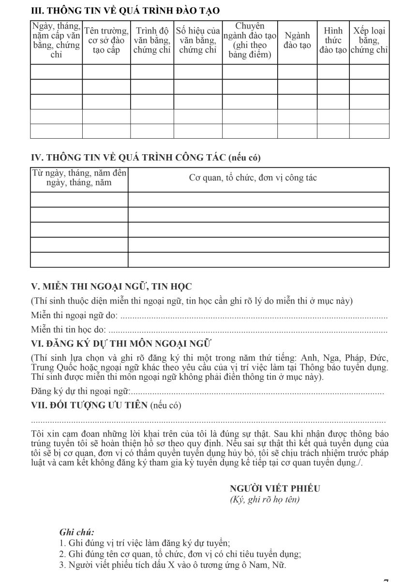 Người đăng ký dự tuyển viên chức trực tiếp nộp Phiếu đăng ký dự tuyển theo mẫu vào 01 vị trí cần tuyển. Người dự tuyển phải khai đầy đủ các nội dung yêu cầu trong phiếu đăng ký dự tuyển và chịu trách nhiệm về tính chính xác của các nội dung kê khai trong Phiếu đăng ký dự tuyển.