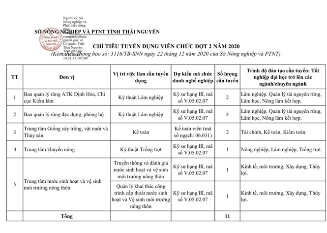 Trên đây là thông báo tuyển dụng viên chức chức đợt 2 năm 2020 của Sở Nông nghiệp và PTNT tỉnh Thái Nguyên.
