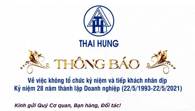 Kính gửi Quý cơ quan, bạn hàng, đối tác! Trong bối cảnh đại dịch COVID-19 còn diễn biến phức tạp, Công ty Cổ phần Thương mại Thái Hưng xin thông báo một số nội dung liên quan đến dịp kỷ niệm 28 năm ngày thành lập doanh nghiệp như sau:
