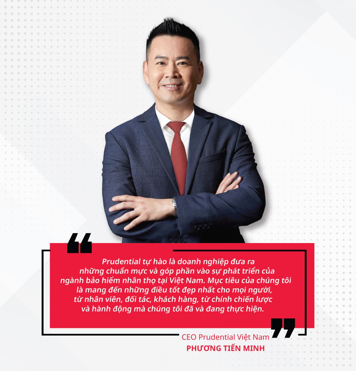 Khẳng định chiến lược “con người là nền tảng”, Ông Phương Tiến Minh, CEO Prudential Việt Nam cho biết: “Prudential tự hào là doanh nghiệp đưa ra những chuẩn mực và góp phần vào sự phát triển của ngành bảo hiểm nhân thọ tại Việt Nam. Mục tiêu của chúng tôi là mang đến những điều tốt đẹp nhất cho mọi người, từ nhân viên, đối tác, khách hàng, từ chính chiến lược và hành động mà chúng tôi đã và đang thực hiện”.