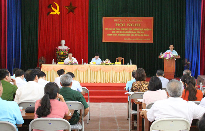 Tại buổi tiếp xúc, đối thoại, đại diện lãnh đạo huyện Phú Bình đã báo cáo nhanh kết quả trả lời của cơ quan chức năng về 26 ý kiến của cán bộ, nhân dân các địa phương đặt ra trong các buổi tiếp xúc cử tri trước đó. Chủ yếu là các vấn đề liên quan đến công tác giải phóng mặt bằng các dự án lớn trên địa bàn như đường vành đai V vùng Thủ đô Hà Nội; xây dựng sân golf; đề xuất hỗ trợ xây dựng phòng, lớp học; nâng cấp lưới điện; giải quyết đơn thư của công dân…