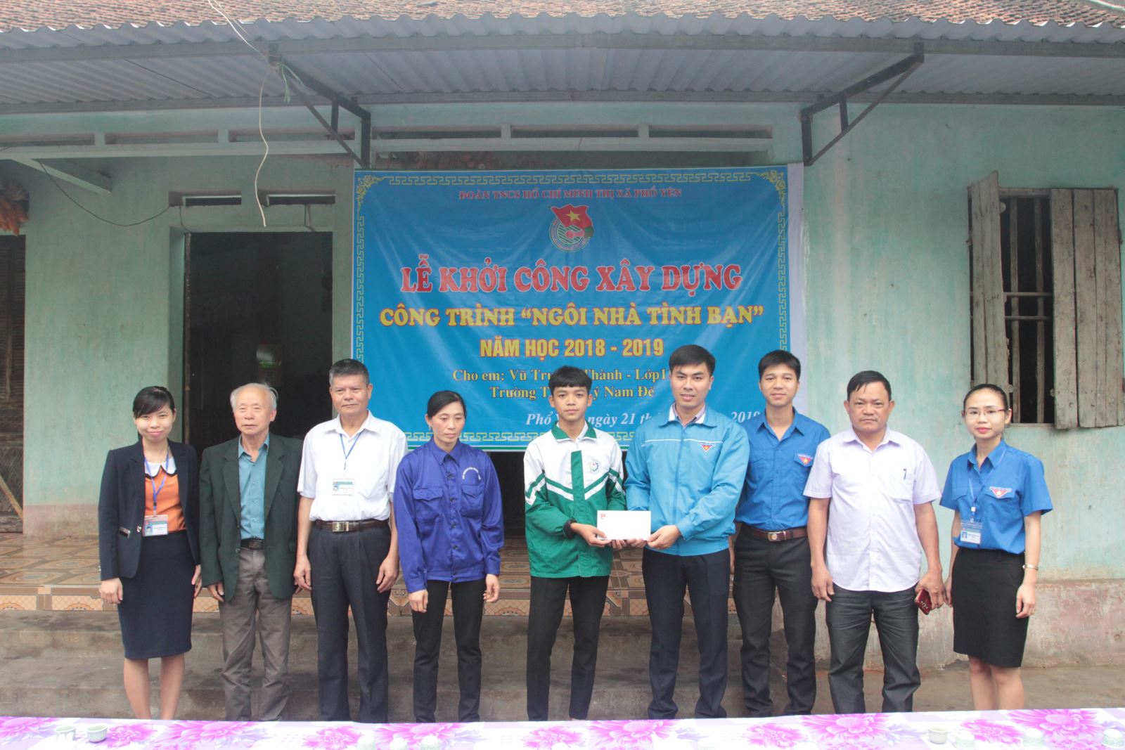 Gia đình em Thành có hoàn cảnh đặc biệt khó khăn, bố mất sớm, một mình mẹ nuôi bà nội già yếu và 2 anh em Thành ăn học. Hiện, cả gia đình sống trong căn nhà nhỏ được xây dựng từ lâu đã cũ hỏng, xuống cấp nhưng chưa có điều kiện sửa chữa, xây mới. Tại Lễ khởi công, Thị đoàn đã trao số tiền 30 triệu đồng trích từ nguồn Quỹ vận động cán bộ, đoàn viên thanh niên Khối THPT trên địa bàn đóng góp (ảnh). Ngôi nhà dự kiến xây dựng với diện tích 80m2, kinh phí khoảng 200 triệu đồng.