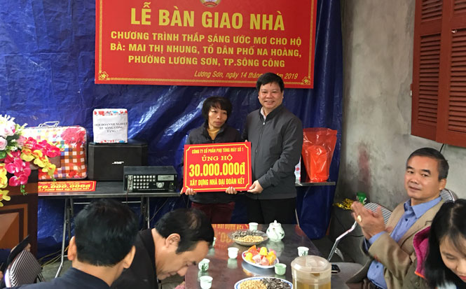 Bà Mai Thị Nhung (48 tuổi) là hộ nghèo. Hiện, bà sống cùng con gái và 2 cháu ngoại, kinh tế gia đình gặp nhiều khó khăn vì 2 mẹ con đều không có việc làm, thu nhập bấp bênh. Trước hoàn cảnh đó, Ủy ban MTTQ T.P Sông Công đã phối hợp với Ủy ban MTTQ phường Lương Sơn hỗ trợ bà Nhung xây dựng ngôi nhà Đại đoàn kết để gia đình ổn định cuộc sống. Sau 3 tháng thi công, đến nay ngôi nhà có diện tích 50m2, trị giá trên 110 triệu đồng đã hoàn thành và đưa vào sử dụng, trong đó Quỹ “Vì người nghèo” tỉnh và các doanh nghiệp hỗ trợ 50 triệu đồng; Hội Chữ thập đỏ và Quỹ “Vì người nghèo” phường Lương Sơn hỗ trợ 4 triệu đồng; số tiền còn lại gia đình vay thêm anh em, hàng xóm…
