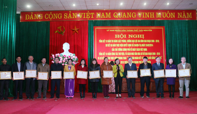 Dịp này, T.P Thái Nguyên cũng đã tuyên dương, khen thưởng 204 tập thể và 205 cá nhân đã có thành tích trong triển khai, thực hiện trong các lĩnh vực: Thi hành Luật Phòng, chống bạo lực gia đình giai đoạn 2008-2018; thực hiện Quyết định số 248/QĐ-TTg ngày 24/02/2014 của Thủ tướng Chính phủ về Ngày sách Việt nam, công tác thư viện, tủ sách nhà văn hóa cơ sở giai đoạn 2008-2018 và thực hiện phong trào “Toàn dân đoàn kết xây dựng đời sống văn hóa”, giai đoạn 2016-2018 (ảnh). \