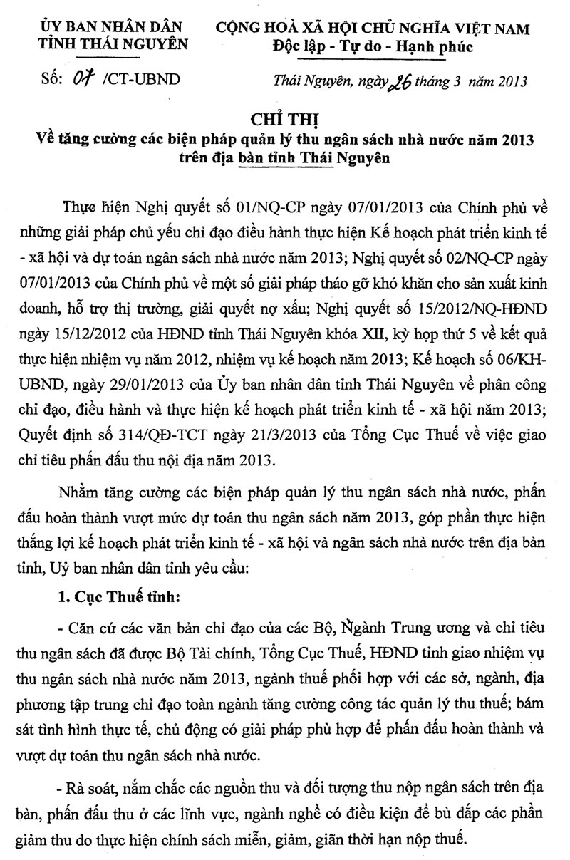 Nhằm tăng cường các biện pháp quản lý thu ngân sách nhà nước, phấn đấu hoàn thành vượt mức dự toán ngân sách năm 2013, góp phần thực hiện thắng lợi kế hoạch phát triển kinh tế - xã hội và ngân sách nhà nước trên địa bàn tỉnh. Ngày 26/3/2013, UBND tỉnh đã ban hành Chỉ thị số 07/CT-UBND về tăng cường các biện pháp quản lý thu ngân sách nhà nước năm 2013 trên địa bàn tỉnh Thái Nguyên. Báo Thái Nguyên điện tử đăng toàn văn Chỉ thị này.