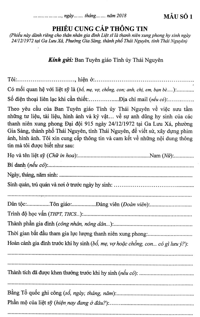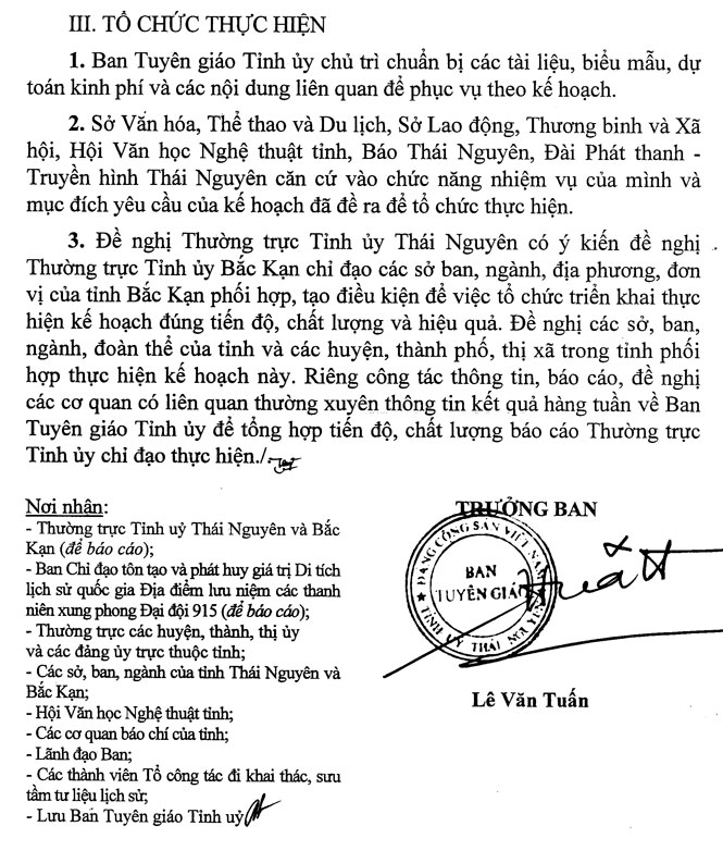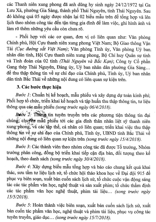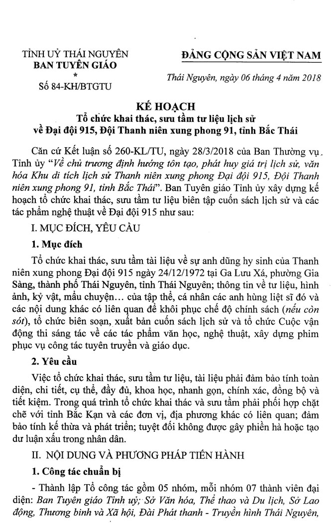 Ngày 6/4/2018, Ban Tuyên giáo Tỉnh ủy đã xây dựng Kế hoạch số 84-KH/BTG Tổ chức khai thác, sưu tầm tư liệu lịch sử về Đại đội 915, Đội thanh niên xung phong 91, tỉnh Bắc Thái. Dưới đây là nội dung Kế hoạch: