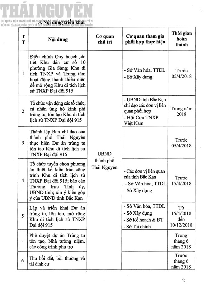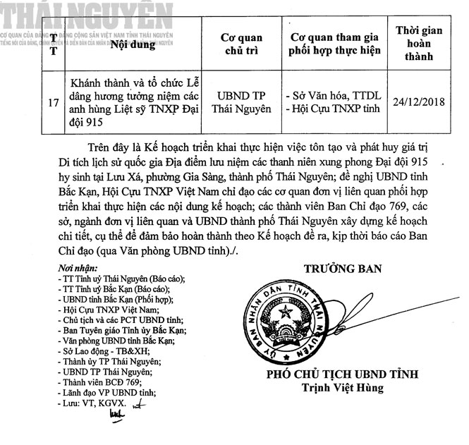 Ngày 3/4/2018, Ban Chỉ đạo tôn tạo và phát huy giá trị di tích lịch sử quốc gia địa điểm lưu niệm các TNXP Đại đội 915 hy sinh tại Lưu Xá, phường Gia Sàng, thành phố Thái Nguyên đã ban hành Kế hoạch số 40/KH-BCĐ triển khai thực hiện tôn tạo và phát huy giá trị Khu Di tích lịch sử Quốc gia Địa điểm lưu niệm các thanh niên xung phong Đại đội 915 hy sinh tại Lưu Xá, phường Gia Sàng, thành phố Thái Nguyên. Dưới đây là nội dung Kế hoạch: