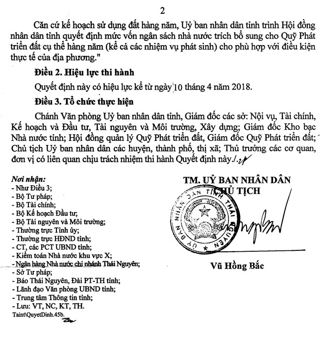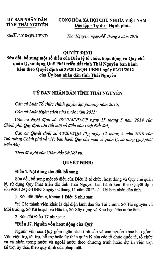 Ngày 28/3/2018, UBND tỉnh đã ban hành Quyết định số 06/2018/QĐ-UBND sửa đổi, bổ sung một số điều của Điều lệ tổ chức, hoạt động và Quy chế quản lý, sử dụng Quỹ Phát triển đất tỉnh Thái Nguyên ban hành kèm theo Quyết định số 39/2012/QĐ-UBND ngày 02/11/2012 của Ủy ban nhân dân tỉnh Thái Nguyên. Dưới đây là nội dung Quyết định này: