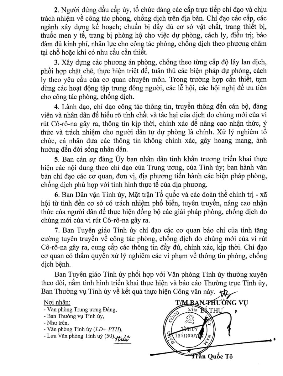 Thái Nguyên là địa phương có đường giao thông nối liền với các tỉnh vùng biên giới, lưu lượng người nước ngoài làm việc tại các doanh nghiệp trên địa bàn tỉnh khá lớn, do đó tiềm ẩn nguy cơ cao dịch bệnh do chủng mới của vi rút Cô-rô-na (nCoV) xâm nhập vào tỉnh. Để chủ động phòng chống dịch bệnh, ngày 30-1, Tỉnh ủy Thái Nguyên đã ban hành Công văn số 1476-CV/TU về việc phòng, chống dịch bệnh viêm đường hô hấp cấp do vi rút Cô-rô-na gây ra.