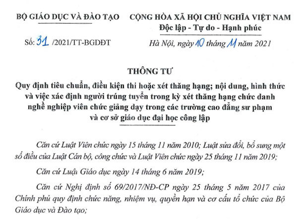 Bộ Giáo dục và Đào tạo đã ban hành Thông tư 31/2021/TT-BGDĐT quy định tiêu chuẩn, điều kiện thi hoặc xét thăng hạng; nội dung, hình thức và việc xác định người trúng tuyển trong kỳ xét thăng hạng chức danh nghề nghiệp viên chức giảng dạy trong các trường cao đẳng sư phạm và cơ sở giáo dục đại học công lập.
