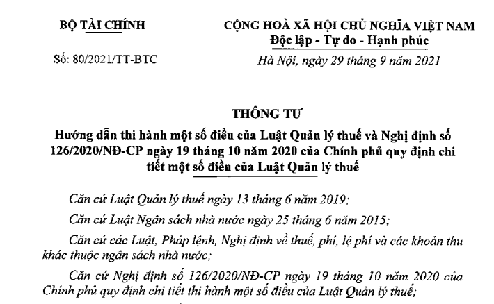 Bộ Tài chính ban hành Thông tư số 80/2021/TT-BTC hướng dẫn thi hành một số điều của Luật Quản lý thuế và Nghị định số 126/2020/NĐ-CP ngày 19 tháng 10 năm 2020 của Chính phủ.