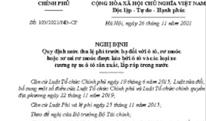 Chính phủ đã ban hành Nghị định số 103/2021/NĐ-CP ngày 26/11/2021 quy định mức thu lệ phí trước bạ (LPTB) đối với ô tô, rơ moóc hoặc sơ mi rơ moóc được kéo bởi ô tô và các loại xe tương tự ô tô sản xuất, lắp ráp trong nước. và các văn bản sửa đổi, bổ sung, thay thế (nếu có). Nghị định 103/2021/NĐ-CP có hiệu lực từ ngày 1/12/2021 đến hết ngày 31/5/2022.