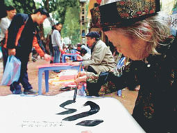 Các cụ đồ, không biết từ nơi đâu tới, trải chiếu mài mực bên xấp giấy hồng đơn. Ai xin chữ, xin đối, mua bức thì sẵn sàng, chữ thảo viết trên giấy đỏ hình vuông, hình thoi dán cột nhà, dán cửa trên.