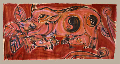 “Trong lối tạo hình của các cụ ngày xưa, tất cả đều có đôi, có cặp, đực – cái, âm – dương…, nó là biểu tượng của sự phồn thực và một cuộc sống tươi mới, đủ đầy. Trong quá trình nghiên cứu kiến trúc điêu khắc đình chùa ở các làng quê Hà Bắc, tôi nhận thấy kiến trúc chạm khắc cổ tại các đình chùa là một đỉnh cao trong điêu khắc Việt Nam, thành ra mình cũng “vận dụng” vẽ lại theo trí nhớ khi sáng tác. Bức tranh con ngựa lấy ý tưởng từ tranh bùa, tranh thập vật; tranh dê, tranh mèo từ một chạm khắc ở chùa Bút Tháp, chùa Dâu…