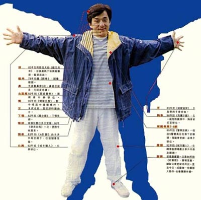 Lưng: Tôi có rất nhiều chấn thương lưng trong các phim của mình nhưng nặng nhất là trong Police Story khi tôi gần như gãy bảy hay tám đốt xương sống gì đó.