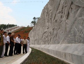 Đáng chú ý là bức phù điêu đại cảnh lớn nhất Đông Nam Á có diện tích trên 430 m2 được ghép bằng 217 tấm đá xanh Thanh Hoá với tổng trọng lượng hơn 300 tấn.