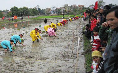 Năm nay, hội thi cấy có 48 thí sinh tham gia chia làm 24 cặp, đây là những nông dân trực tiếp làm ruộng có độ tuổi từ 18-50, nhiều kinh nghiệm trong sản xuất nông nghiệp trên địa bàn huyện đã qua nhiều vòng lựa chọn. Các cặp thí sinh thi theo hình thức tiến hành cấy trên diện tích theo thứ tự đã quy định trên ruộng với số lượng mạ đã được chuẩn bị sẵn bằng giống lúa VL20. Yêu cầu của hội thi cấy năm nay cũng khá khắt khe, các cặp thí sinh phải cấy nông tay, thẳng hàng, đúng mật độ 45-50 khóm/m2 và chỉ được cấy 1 rảnh/khóm, cặp thí sinh nào cấy đúng kỹ thuật và được nhiều diện tích nhất là cặp đạt giải. Thí sinh Lã Thị Ngọ cho biết: Tôi đã nhiều lần tham gia hội thi cấy ở làng và đây là lần mà ban tổ chức đặt ra yêu cầu khắt khe nhất, song tôi cho rằng đây chính là cơ hội để tôi rèn luyện kỹ năng cấy của mình.