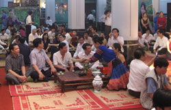 Xin nói thêm về trà, thứ cây lá gắn bó, gần gụi với cuộc sống con người. Từ thuở lọt lòng, nhiều người mẹ đã pha trà lấy nước tắm cho con. Khi các cụ đến “ngày trăm tuổi”, con cháu lại thường dùng trà “lót áo” cho người khuất núi. Vâng! ấm trà là đầu câu chuyện, cư dân thị thành hay thôn dã đều có tục pha trà mời khách. Mà trà uống thấy ngon nhất là lúc thanh vắng hoặc khi gặp được bạn hiền để nhàn đàm thế sự. Một cầu kỳ của các bậc tiền nhân là dùng trà ướp trong đóa sen mới nở, hoặc lấy gạo sen ướp với trà, ủ trong chum. Sớm ra, lúc ông mặt trời chưa thức dậy đã vội bơi thuyền trên mặt đầm hứng lấy những giọt sương đọng lại trên lá sen, mang về làm nước pha trà.