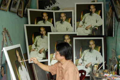 Giở cho tôi xem sổ lưu ký và đặt hàng từng nơi, từ những năm từ 2000 đến nay, rôi ông đưa tôi xem bức chân dung Bác thứ 520 mới hoàn thành. Hầu như tất cả các tác phẩm này ông đều vẽ kích thước lớn theo yêu cầu của khách hàng với chất liệu sơn dầu, nên mầu sắc tươi sáng và bền chắc với thời gian.