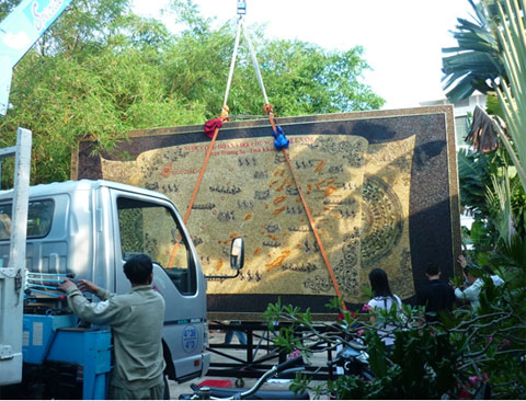 Sau khi tấm bản đồ được dựng lên giá đỡ, những người thực hiện sẽ tiếp tục hoàn thành khâu cuối cùng là định vị các đường kinh tuyến, vĩ tuyến, các bảng tên địa lý lên tấm bản đồ để kịp ra mắt trong ngày khai mạc Festival Biển 2011.