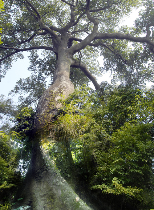 Quả không phụ công tìm kiếm của tôi, đó là một cây Sui sừng sững, gốc khoảng chừng 15-17 mét. Nếu tính các bẹ cây tỏa ra xung quanh thì khoảng hơn 20 mét. Nghển cổ nhìn mãi không thấy ngọn cây, tôi chỉ thấy các chạc ba, chạc bẩy uốn lượn thành hình rất đẹp, lá sum suê tươi tốt.
