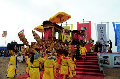 Sau màn tế lễ, người sắm vai vua Lê Đại Hành được mặc long bào, đeo mặt nạ