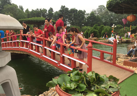 Du khách tham quan hồ cá Koi Nhật Bản.