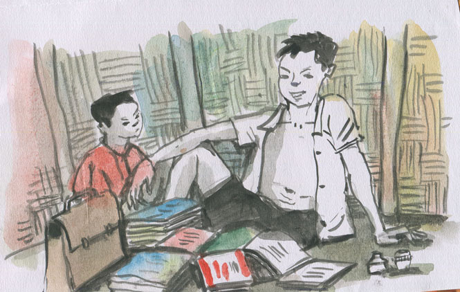 Năm nào cũng vậy, đi qua những ngày hè oi ả, vào thời điểm ngày khai trường cận kề, “công cuộc” chuẩn bị “áo” mới cho những cuốn sách của chúng tôi lại tất bật. Mấy chị em sẽ chia nhau chạy đôn, chạy đáo đi các nhà trong xóm (hầu hết là các bác cán bộ hưu trí, con đã lớn, thường đọc báo hoặc những gia đình vừa mới xây nhà xong) để xin báo cũ, vỏ bao xi măng về bọc sách. Dưới đôi bàn tay khéo léo của chị cả và chị thứ hai, những quyển sách cũ sau khi được bọc bìa gọn gàng đã trở nên bắt mắt hơn rất nhiều.