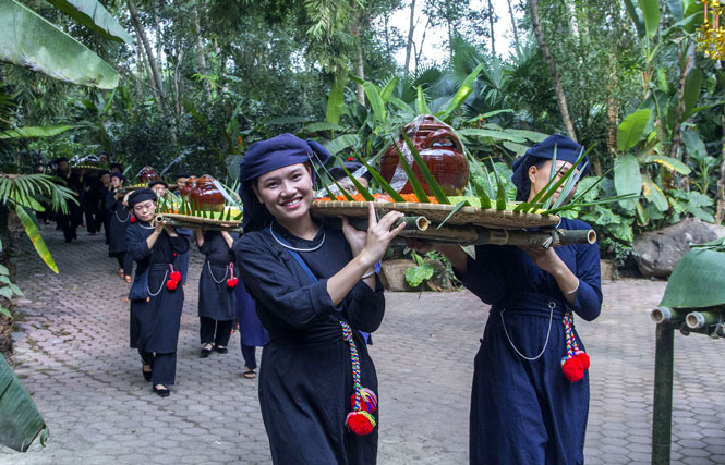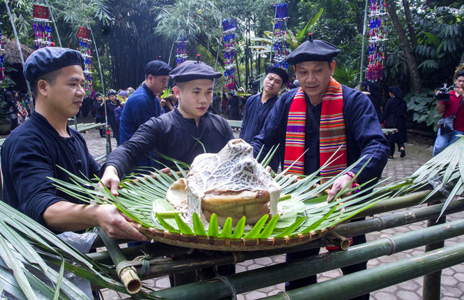 Trước khi làm lễ, đông đảo bà con trong làng đã cùng nhau chuẩn bị lễ cúng thần linh, tổ tiên với các sản vật được chế biến khéo léo qua đôi tay người phụ nữ Tày như: Xôi ngũ sắc, bánh chưng, bánh khảo, bỏng gạo, thịt lợn…