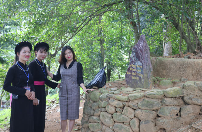 Du khách chụp ảnh kỷ niệm bên cây Râm bụt Bác trồng trước mái lán Tỉn Keo, xã Phú Đình (Định Hóa).