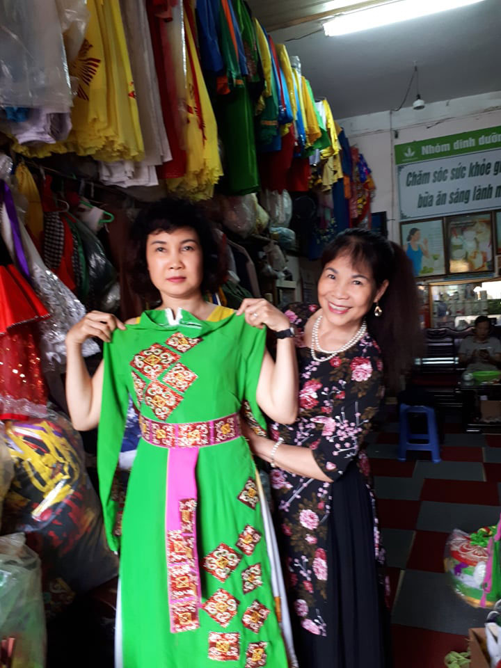 Đấy là các “dòng” chính. Mỗi dòng lại chia ra dăm bẩy “nhánh”. Ví như điệu múa sen có đến 5-6 kiểu váy, hoa, mũ đội đầu khác nhau. Ngay như áo dài tứ thân cũng “biến hóa” màu sắc sao cho phù hợp với khung cảnh, màu của phông màn sân khấu. Thế nên, khó có cửa hàng nào đủ các loại đáp ứng được hết yêu cầu của khách.