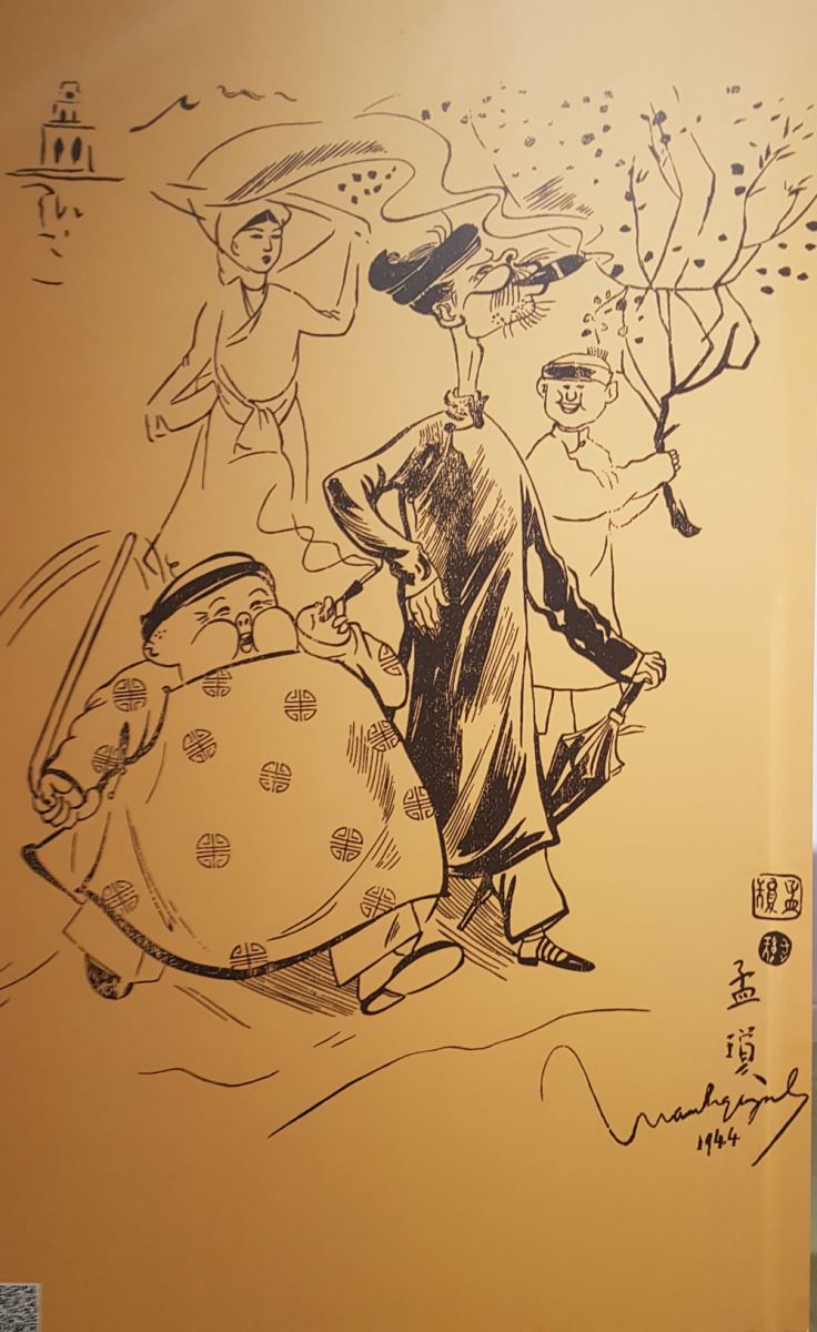 Triển lãm không chỉ kể câu chuyện đi lễ chùa đầu năm, nhiều câu chuyện đã quá quen với thế hệ của ông Trịnh Lữ cũng được trưng bày. “Bức này vẽ 2 nhân vật Lý Toét - Xã Xệ, anh béo - anh gầy. Họa sĩ Mạnh Quỳnh là tác giả bức này. Tôi cho là 2 nhân vật này ảnh hưởng 2 nhân vật truyện của Pháp nổi tiếng bấy giờ là Loren và Hardy, cũng một gầy một béo”, ông Trịnh Lữ cho biết.