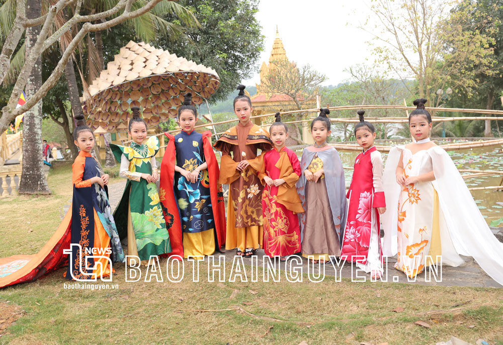 Các “người mẫu nhí” của Thái Nguyên trình diễn bộ sưu tập áo dài “Sen Việt” tại triển lãm trưng bày không gian “Sen trong đời sống văn hóa Việt”.