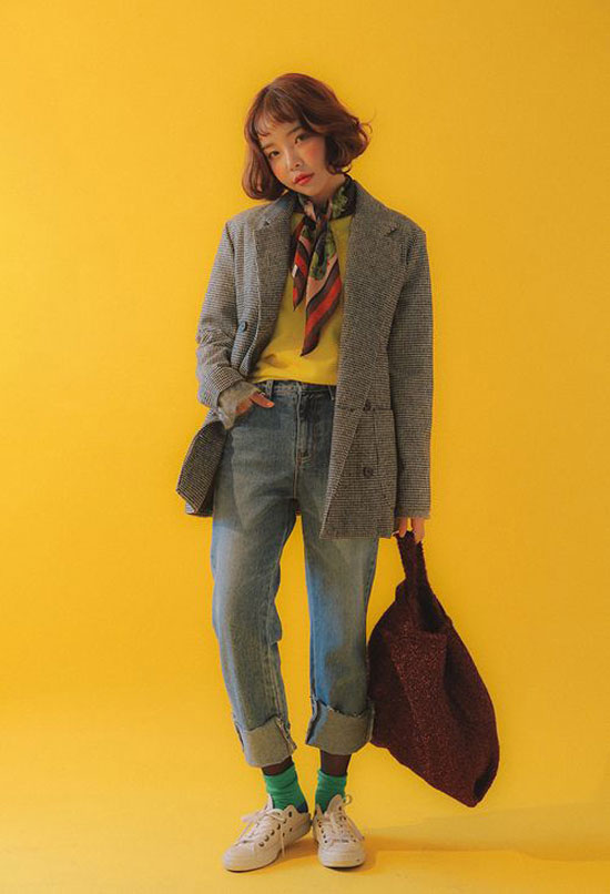 Trên set đồ tông màu trung tính gồm áo blazer, quần jeans xanh cổ điển, gam vàng trở thành điểm nhấn nổi bật.