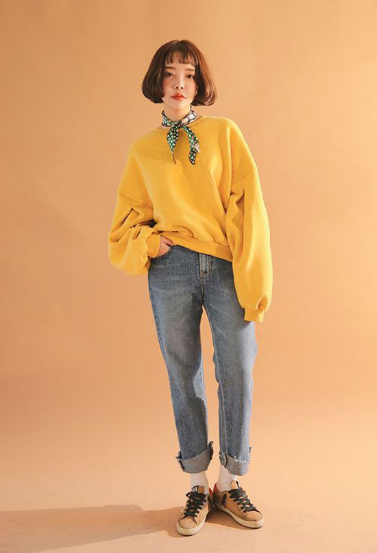 Gam vàng với nhiều sắc độ khác nhau vẫn được ưa chuộng trong không khí Thu Đông. Nó được mang vào các mẫu chân váy xếp ly, áo sweater, áo hoodie giúp phái đẹp thỏa sức mix-match.