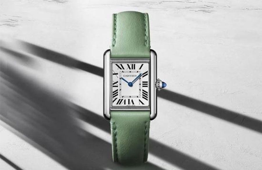 Năm nay, Cartier ra mắt chiếc đồng hồ Tank Must mới, ngoài phong cách đơn sắc nó còn có một phiên bản với thân đồng hồ cổ điển cùng dây đeo màu xanh bạc hà. Chiếc đồng hồ này sử dụng vỏ thép không gỉ với mặt số màu trắng, vạch giờ La Mã màu đen và kim hình thanh kiếm màu xanh mang tính biểu tượng rất dễ nhận biết. Vương miện được đặt bằng một cabochon Spinel tổng hợp màu xanh lam.