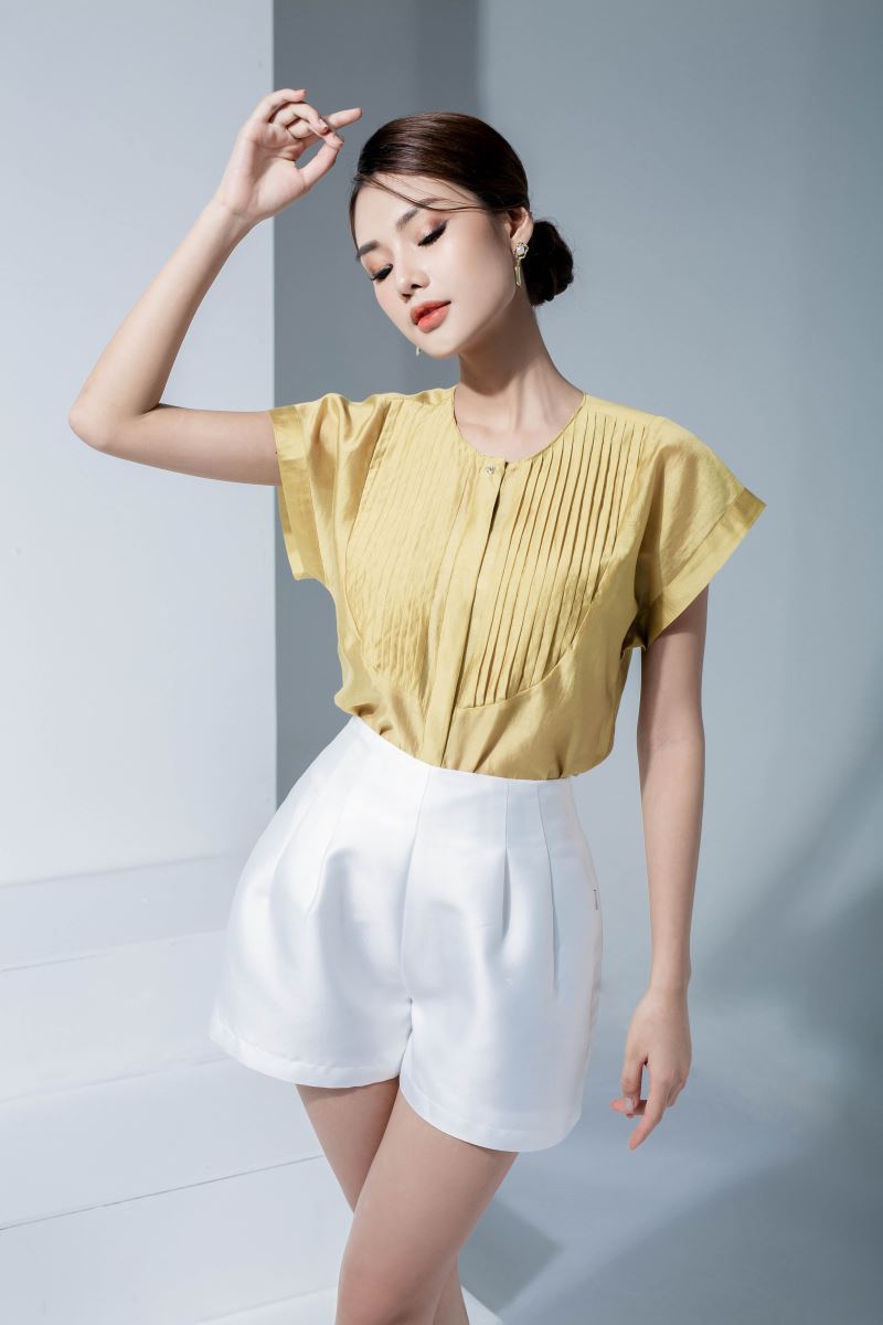 Quần shorts đen mix với áo xếp li điệu đà trễ vai mang đến vẻ đẹp nền nã cho người mặc.
