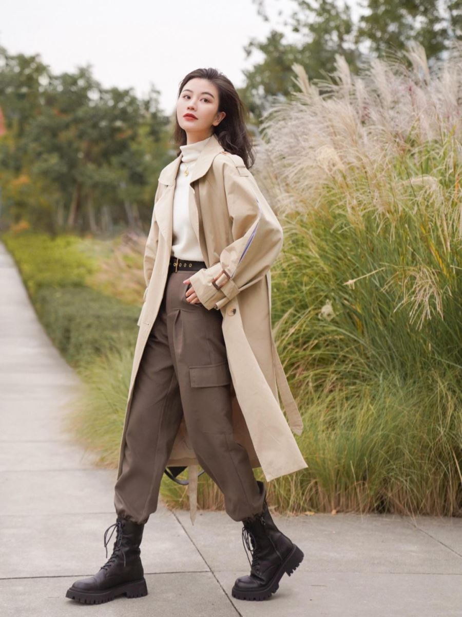 Áo măng tô mix với boots Martin và quần boom tạo nét cá tính, sành điệu cho nàng xuống phố vào những ngày chớm lạnh.