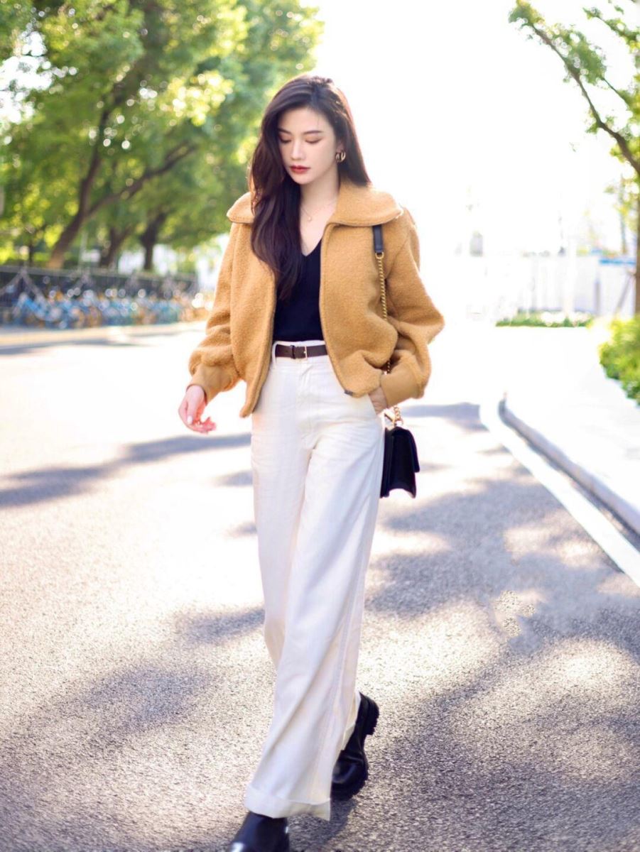 Là một loại vải dệt kim, có độ co giãn tốt, không rụng lông, rất thích hợp cho những ngày đầu thu. Những chiếc áo khoác lông cừu ngắn tạo sự trẻ trung và cải thiện vòng eo ở một mức độ nhất định, tôn vóc dáng.