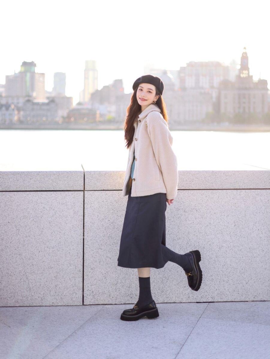 Áo khoác lông cừu ngắn có thể mix cùng chân váy và giày lười giúp bạn ghi điểm thời thượng.