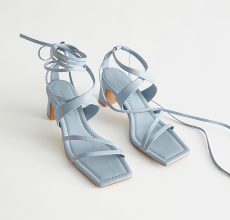 Tinh tế, mềm mại và thanh lịch, đôi xăng đan màu xanh lam nhạt của & Other Stories có mũi vuông và gót thấp với nhiều dây buộc ôm lấy bàn chân.